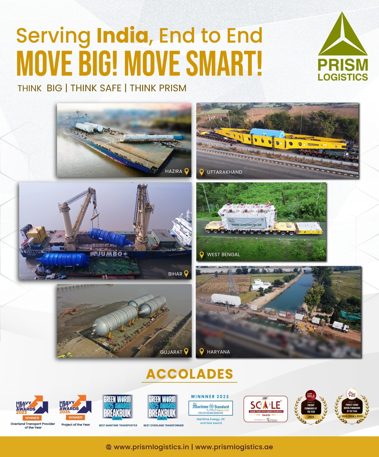 Serving India, end-to-end — moving the nation’s heaviest ambitions with precision, safety, and scale. From Hazira to Uttarakhand, Bihar to West Bengal, Gujarat to Haryana — every project reflects our commitment to delivering complex logistics solutions seamlessly. Move Big. Move Smart. Move with Prism.